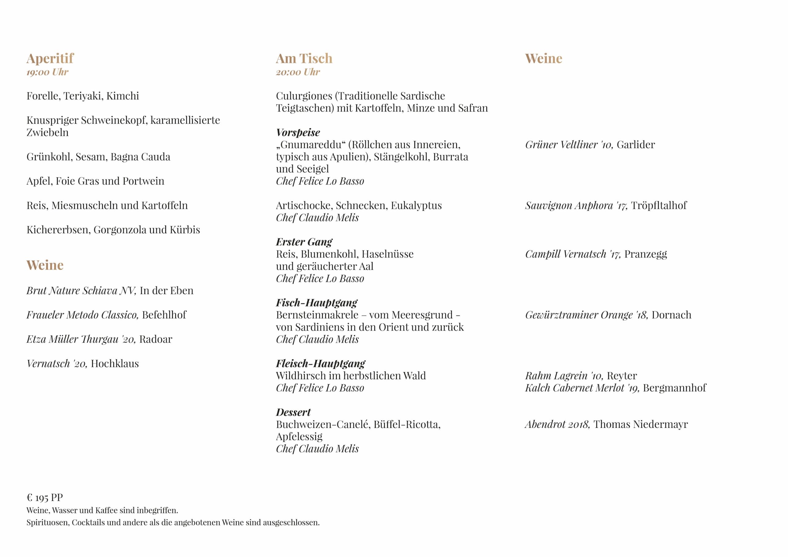 In der Küche kommt es zu einem besonderen Treffen: Gastkoch Felice Lo Basso bringt seine Sternevisionen mit, um gemeinsam ein überraschendes Menü zu kreieren – abgestimmt auf die seltenen Naturweine des Kollektivs CON VIN TI, einer Gemeinschaft von handwerklichen Winzern und Erzählern des Naturweins.