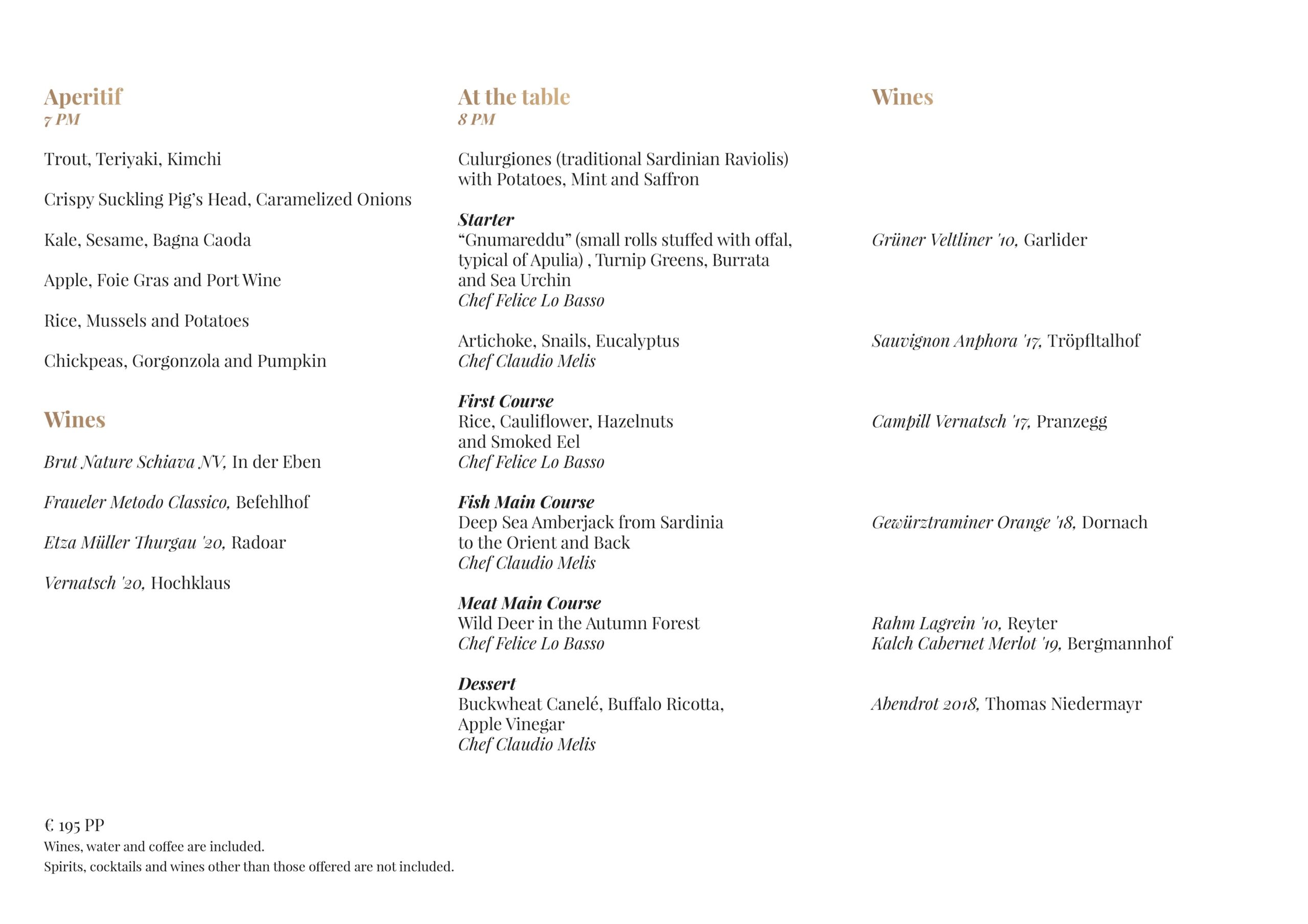 In the kitchen, an exceptional encounter with guest chef Felice Lo Basso: two Michelin-starred visions will create a surprising menu designed to pair with rare wines from CON VIN TI, a collective of artisanal winemakers and storytellers of natural wine.